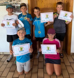 Herzlichen Glückwunsch nochmals an alle Sieger!! In den anschließenden Siegerehrungen gab es neben den begehrten Medaillen für alle teilnehmenden Kinder eine Urkunde und tolle Sachpreise. Ein herzliches Dankeschön gilt den Eltern für die Kuchenspenden. Außerdem geht ein herzlicher Dank an unsere Jugendwartin Isabella Baier für die Organisation und an alle Helfer: Sandra Mahlenbrei, Monika Wurst, Elena Weiß, Roswitha Bayer und Tanja Buzengeiger. Alle Genannten waren nebst Mona Selg, Maik Schweizer und Boris Thömmes den ganzen Sommer auch rund um das Jugendtraining im Einsatz. Auch hierfür herzlichen Dank.