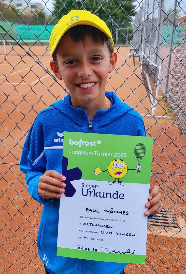 Altshausen, 21.09.2025. 70 Kinder gingen in 4 Gruppen an den Start. Die Kinder spielten im Kleinfeld mit besonderen Regeln, welche vom Sponsor BOFROST vorgegeben wurden. Ein Spiel dauerte 12 Minuten, wer in dieser Zeit in Führung lag, hatte gewonnen. In der größten Gruppe, der Kategorie U10, startete Paul Thömmes. Er musste sich dort mit Gleichaltrigen aus Vereinen wie Ulm, Schwendi und Ravensburg messen. Aus den Gruppenspielen ging Paul deutlich als Gruppensieger hervor. Auch im Achtel- und Viertelfinale erkämpfte er sich den Sieg und erreichte somit das Halbfinale. Dort unterlag er dem späteren Turniersieger aus Ravensburg. Beim Spiel um Platz 3 lag Paul gegen seine Kontrahenten aus Schwendi ziemlich schnell 1:5 zurück. Nach einer spannenden Aufholjagd lief ihm jedoch die Zeit davon und er verpasste das Treppchen knapp mit 4:5. Paul war stolz auf seine hervorragende Leistung. Herzlichen Glückwunsch.
